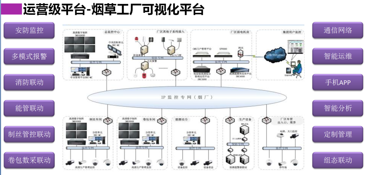 公司致力于煙草的智能工廠建筑。通過對(duì)工廠生產(chǎn)指揮系統(tǒng)、安全防范指揮系統(tǒng)、智能會(huì)議的有機(jī)結(jié)合,研發(fā)出智慧煙草綜合安全管理系統(tǒng),打造了煙草煙葉的智慧工廠群,為煙草行業(yè)智能工程方面的絕對(duì)領(lǐng)軍人物,市場覆蓋全國三分之一的省份,占有率遙遙領(lǐng)先。